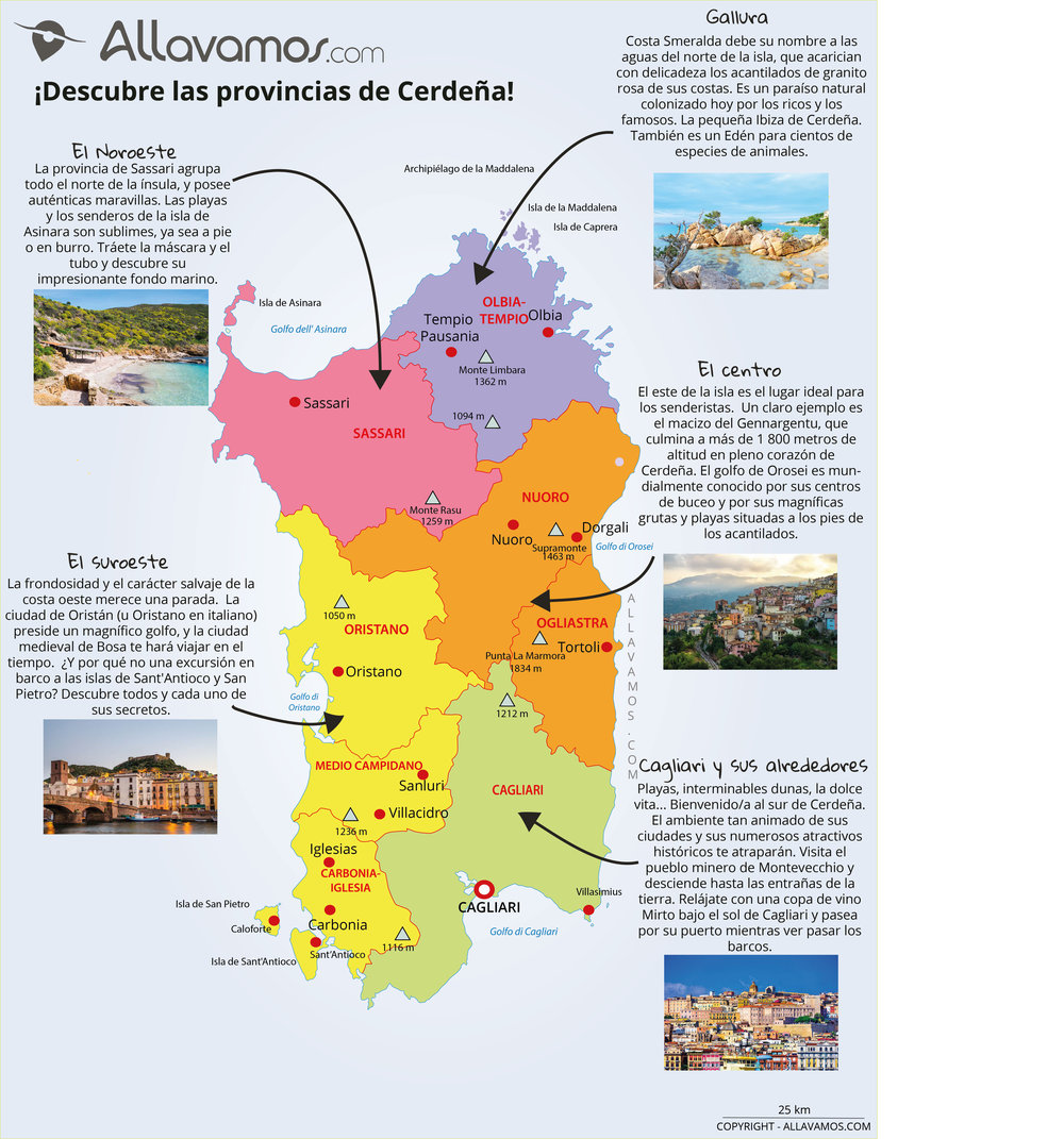 Sus hermosas playas, sus pueblos medievales y sus monumentos históricos hacen de Cerdeña una de las mejores islas del Mediterráneo. Para los amantes de la aventura, Cerdeña ofrece un espectacular terreno de montañas, vegetación, grutas y picos rocosos. Para ayudarte a preparar tu viaje a Cerdeña, hemos realizado algunos mapas para que puedas conocer las zonas más importantes de la isla. En primer lugar, encontrarás un mapa con los principales lugares para que tengas un primer contacto con la isla. Seguidamente, un mapa con los lugares que no te puedes perder. Por último, encontrarás un mapa de distancias y trayectos para que, si alquilas un coche en Cerdeña, puedas planificar a la perfección tus recorridos. No olvides echarle un vistazo al mapa de playas si te apetece disfrutar de un poco de playa o de una sesión de buceo. Si quieres empezar a mimetizarte con el entorno, visita nuestro apartado «visita virtual» para descubrir los lugares más importantes de la isla desde tu casa.
