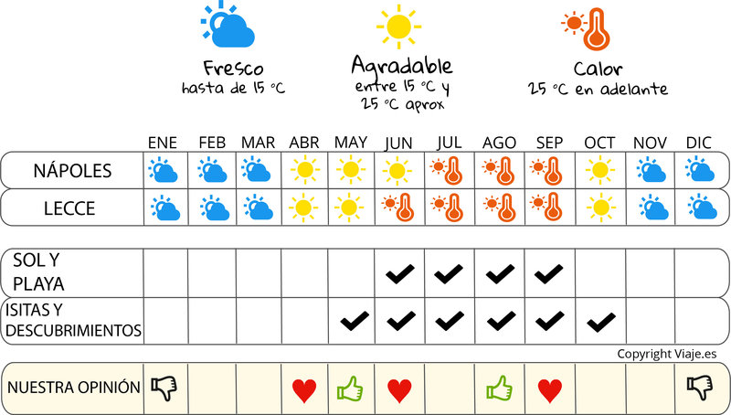 El sur de Italia, que se extiende desde Nápoles hasta la Puglia, pasando por la región de Calabria en la punta de la bota, goza de un clima templado en verano, aunque los inviernos son bastante duros en comparación con los del sur de Europa. Los italianos coinciden en que la mejor época para visitar el sur es la primavera, ya que todos los campos están en flor y los días son cada vez más largos, pero las temperaturas siguen siendo demasiado frías como para darse un baño. El período de vacaciones escolares de verano, de julio a septiembre, es ideal para disfrutar del Mediterráneo, aunque hay muchísimos turistas en esta época del año.
